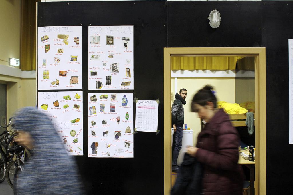 _MG_1804b in a former sportshall live about 50 people, basic text and visual information in several languages for the migrants , |